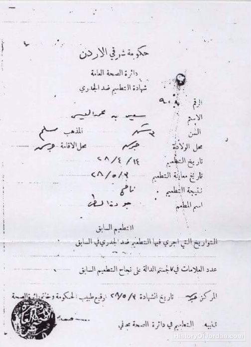 شهادة تطعيم ضد مرض "الجدري" للمرحوم سعيد الغزاوي ، صادرة من جرش